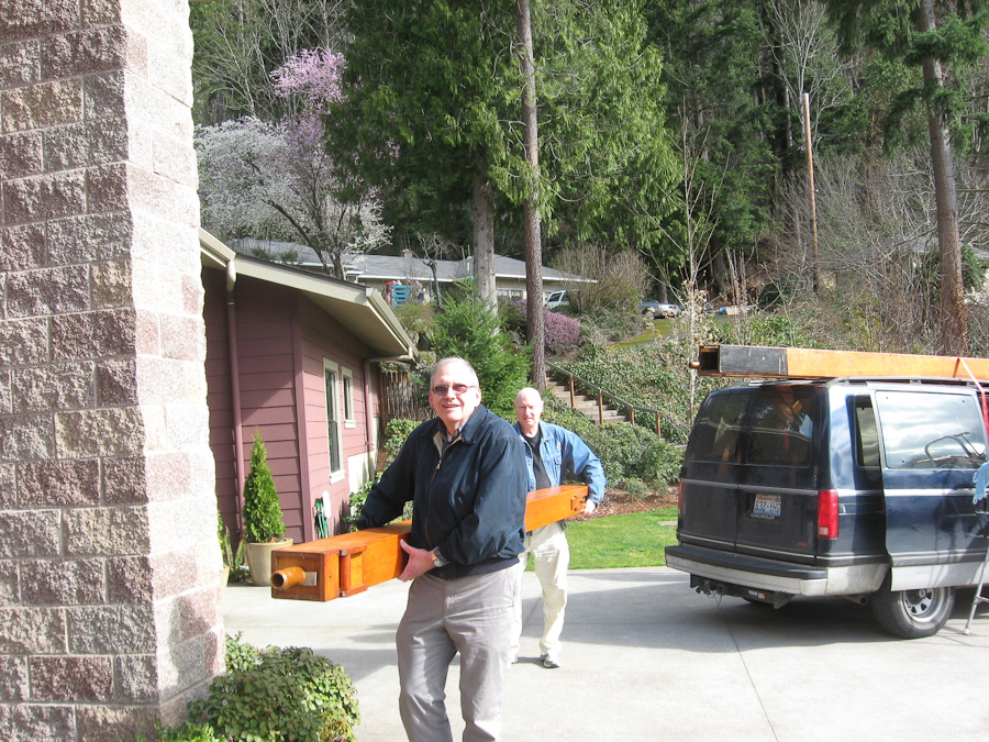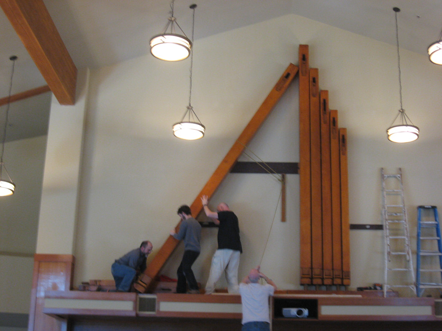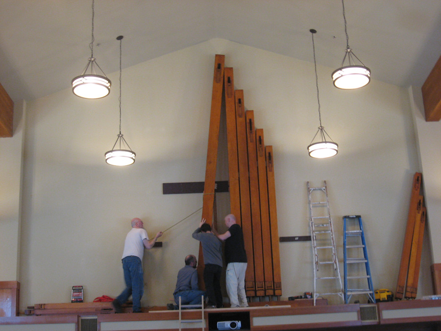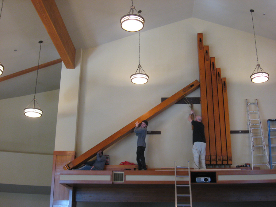 March 22, 2011 was an exciting day for the volunteers for the Foundation and for Covenant Presbyterian Church. The reason is that the Antiphonal organ began taking shape at the back of the sanctuary. In preparation for this day, Jim R. and John R. of the church took down the sound panels on the back wall and did patchwork and painting on the wall. The first stage of the installation was that of the bottom two octaves of a 1911 Austin 16' Violone rank. After extensive preparation of these pipes, they were loaded in and on the top of two vans and taken to the church. Upon arrival at the church, everyone was greeted with truly inspiring organ music by one of the church's organists, Jim W. As volunteers brought in the pipes, they were thrilled by the music coming from the organ they had worked on for more than a year.