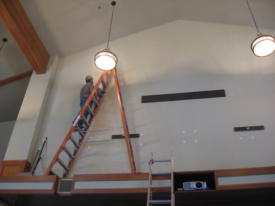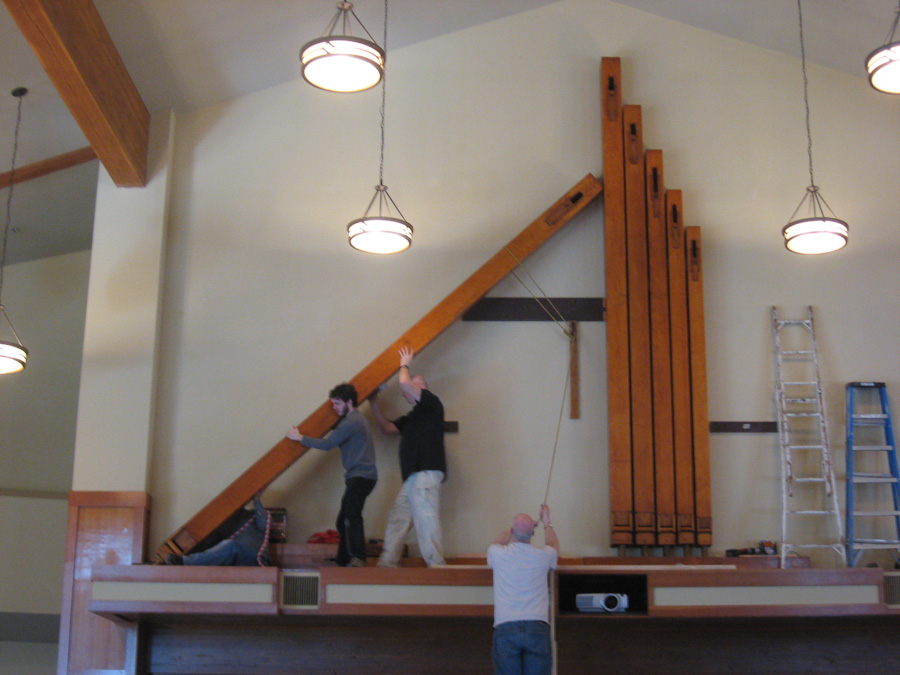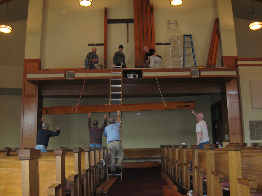 As the racking had already been mounted on the back wall, some of the smaller Violone pipes could be easily put into place. However, as the ledge where the Antiphonal organ will sit is only a little more than 3 feet wide and yet 13 feet off the sanctuary floor, it took considerable planning and experimentation to figure out how to get the big pipes safely up onto the ledge and then in a vertical position and fixed in place. Wes and Jim R. took the lead in this planning, but major thanks are also expressed to Carl P. and John R. who were up on the ledge for hours and to Jim J., Fred, and Carl D., who were on the floor providing important support. The longest of the pipes is 17 feet long and it weighs 80-90 pounds. The photos show how raising this pipe was done on a step by step basis. (Photos can be enlarged by clicking on them)