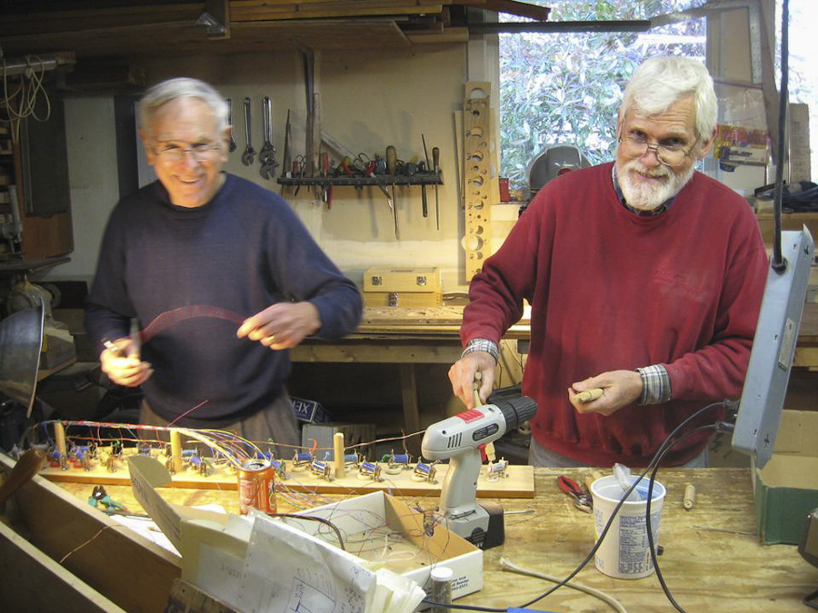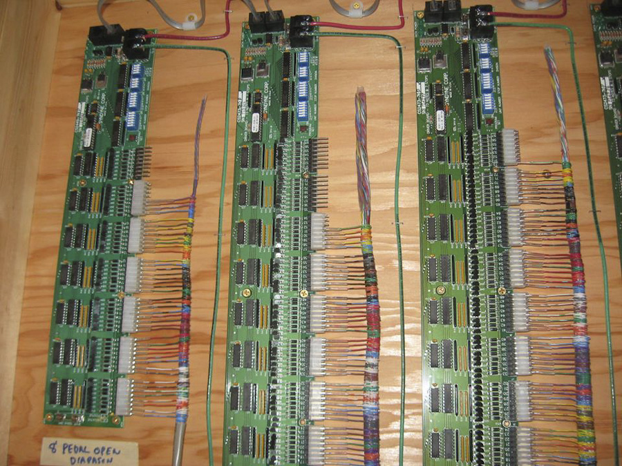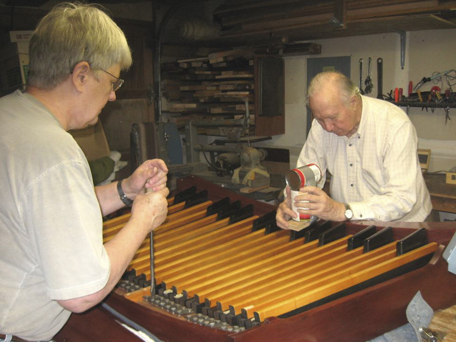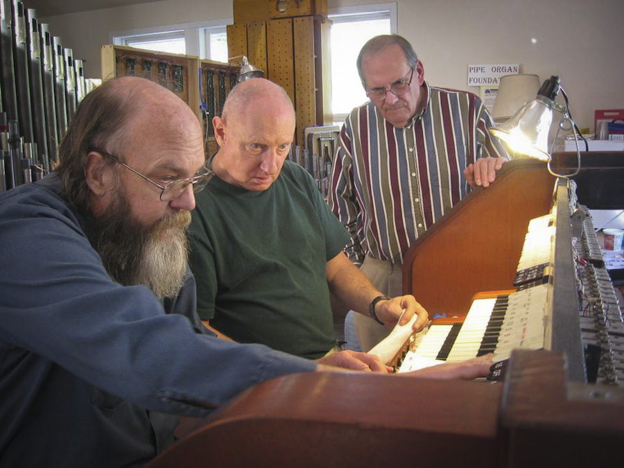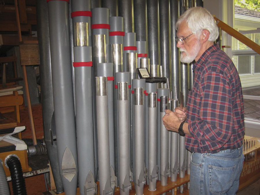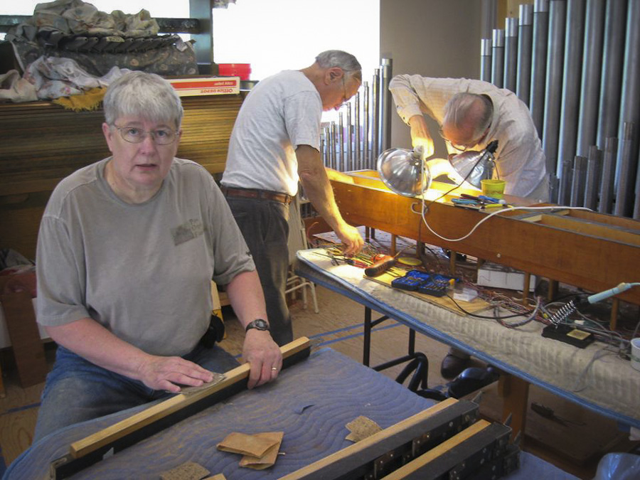 The pictures on the left sidebar show some of the many tasks that volunteers did in order to bring this organ into service. Click on the photos to see larger images. Other tasks, done earlier by volunteers, are shown in the photographs of volunteers presented in an earlier page of this website. The last portion of the organ to be completed is the Antiphonal organ which will be at the back of the church. As one of the photos shows, this will include full length 16' Violone pipes that will be put on the back wall and which will stretch nearly up to the ceiling. In front of them will be other pipes including a Geigen Principal, a flute (Melodia), a reed (Harmonic Cornopean), and a string (Violone) rank. The result will be a surrounding effect that will bathe the congregation in sound.