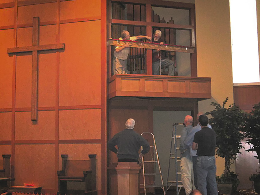In October, 2010, our volunteers finished work on the console and on the six ranks of pipes that were to be placed in the "flower boxes" on each side of the front of the church. These items were then taken to the church and put in place. It was also necessary to make a number of adjustments in the organ that was playing there at that time in order to integrate the new instrument with the old one. The product of all of this was that the organ played for the first time for the Thanksgiving Eve service, 2010.