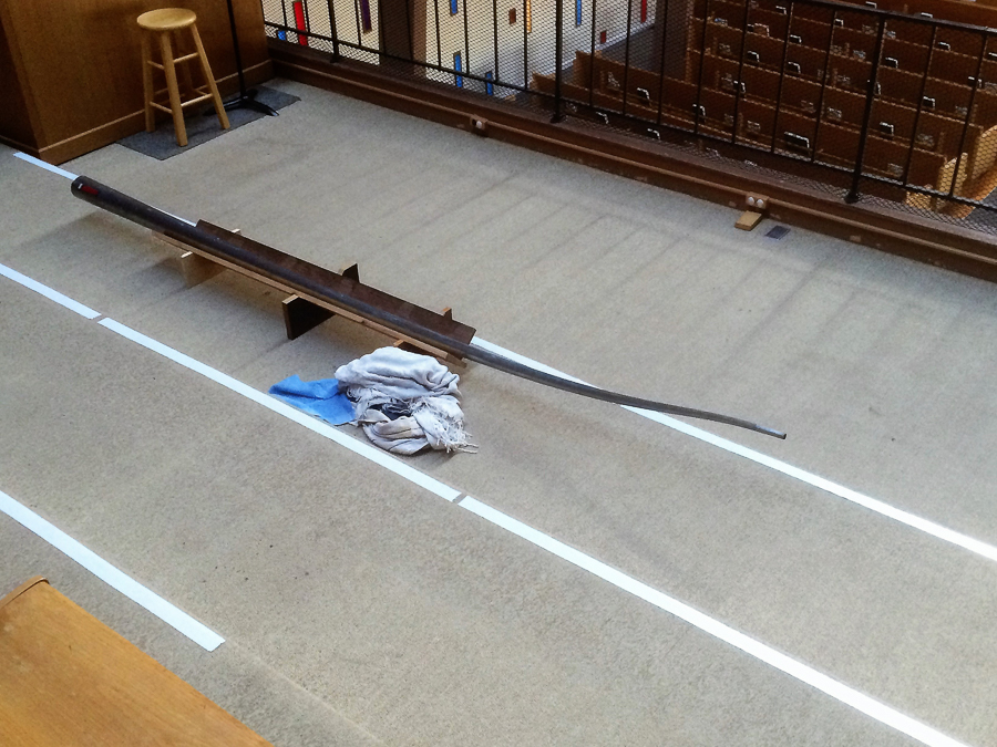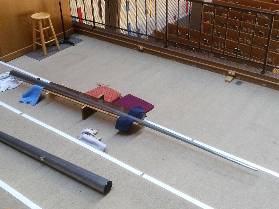 While the Foundation tuned the organ on March 10, 2016, the major repairs were not begun until May. The most difficult of these was straightening the 16’ Fagott zinc resonators, some of which had not been hooked and were crooked and leaning forward dangerously. The photos show how badly some of the pipes were bent. Volunteers Carl Dodrill, Carl Presley and Barbara Graham worked on this problem spent using a wooden 'trough' in which pipes were positioned and then pressed downward in order to straighten them. The work was done very slowly and methodically, but with excellent results. The entire effort brought to mind the Bible verse “…and the crooked shall be made straight” (Isaiah 40:4). Other work included tuning and troubleshooting.
