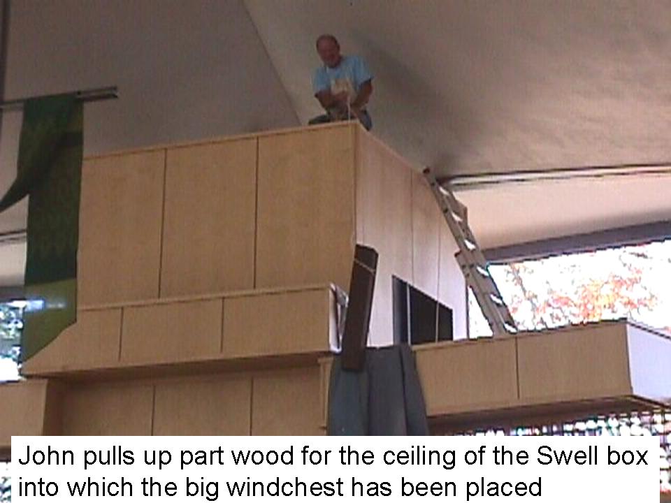 Photo 2. John pulls up part of wood for the ceiling of the Swell box into which the big windchest has been placed.