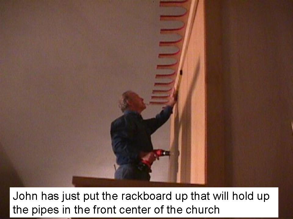 Photo 4. John has just put the rackboard up that will hold up the pipes in the front center of the church.
