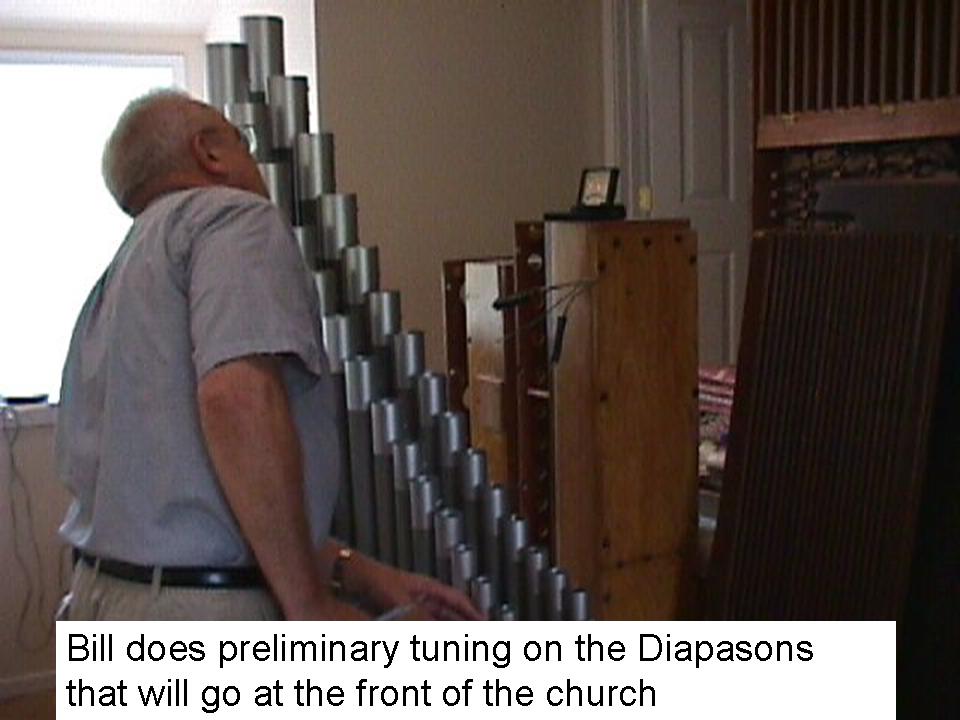 Photo 13. Bill does preliminary tuning on the Diapasons that will go at the front of the church.