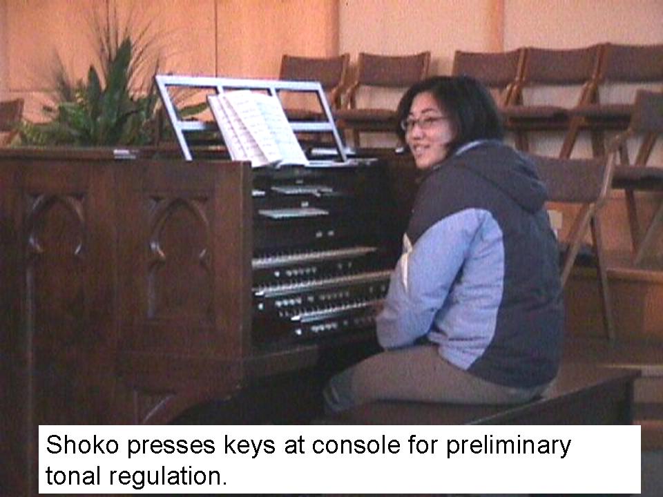 Photo 15. Shoko presses keys at console for preliminary tonal regulation.