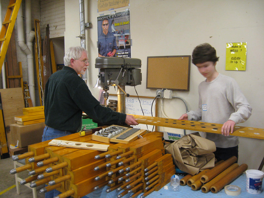 The photographs in the left sidebar show some of the tasks that our volunteers did to make this rebuilt and expanded organ a reality for Roosevelt students. You can click on the photos to see larger images.